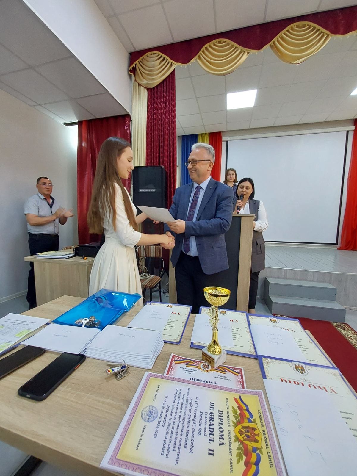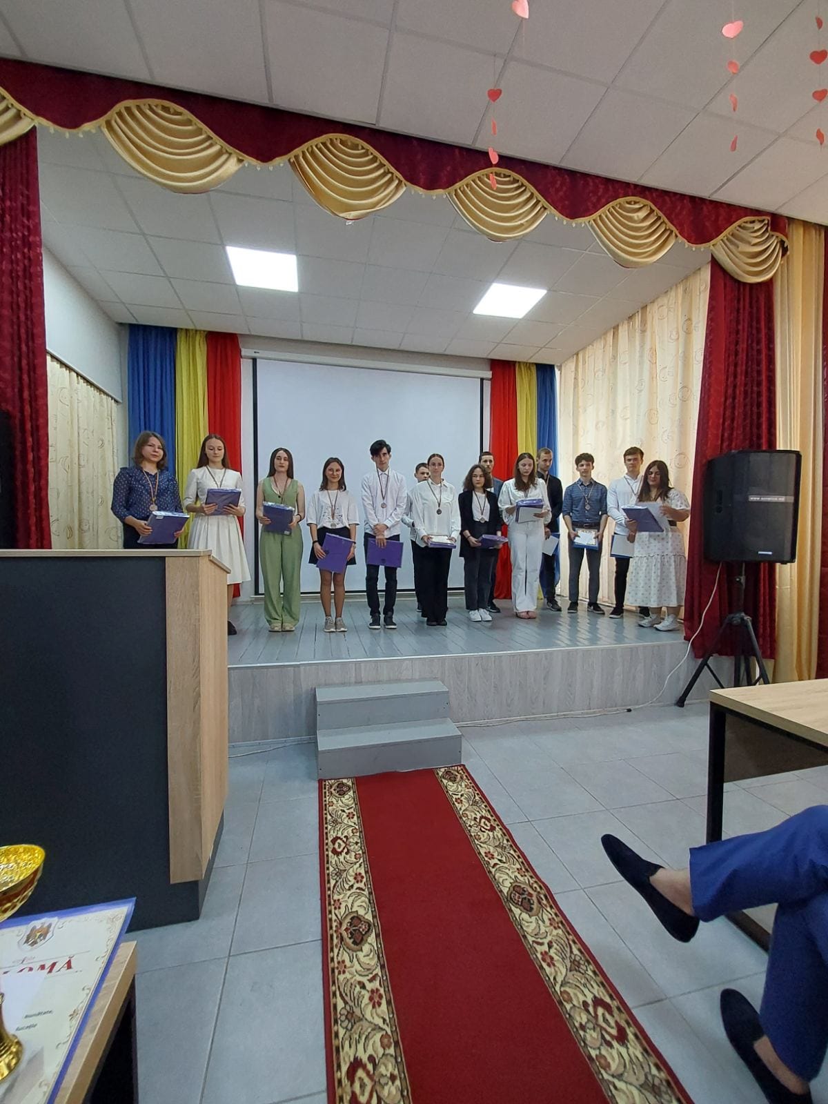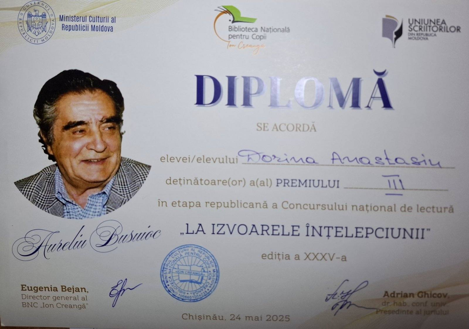 24.05.2025La 24 mai 2025, a avut loc etapa republicană a concursului național de lectură „La izvoarele înțelepciunii” organizat de către Ministerul Culturii al Republicii Moldova, Ministerul Educației și Cercetării, Biblioteca Națională pentru copii "Ion Creangă " Chișinău și Biblioteca "Grigore Vieru" din Cahul . Acest concurs, ajuns la cea de-a XXXV-a ediție, are ca scop promovarea lecturii și familiarizarea elevilor cu viața și activitatea personalităților din literatura, cultura, istoria națională și universală. Fiecare ediție are ca temă viața și activitatea unei personalități, iar anul acesta a fost consacrată scriitorului Aureliu Busuioc. Eleva noastră din clasa a X-a „A”profil umanist, Anastasiu Dorina, a reușit să se claseze pe locul III. Suntem extrem de mândri de rezultatul obținut și îi transmitem felicitări din suflet și încurajări pentru această realizare deosebită! Aducem sincere mulțumiri doamnei profesoare de limba și literatura română Marcu Alexandra și doamnei bibliotecare Matcaș Oxana pentru îndrumarea valoroasă și sprijinul oferit. Felicitări, Dorina! Suntem convinși că acest succes este doar începutul unui drum plin de realizări frumoase! Prin pasiunea ta pentru lectură, ai demonstrat nu doar o profundă înțelegere a textelor, ci și o sensibilitate aparte și o maturitate în gândire. Rezultatul obținut la concurs reflectă efortul, curiozitatea intelectuală și dragostea autentică pentru cărți. Ești un adevărat exemplu pentru colegii tăi și o sursă de mândrie pentru noi toți. Continuă să citești, să visezi și să inspiri!