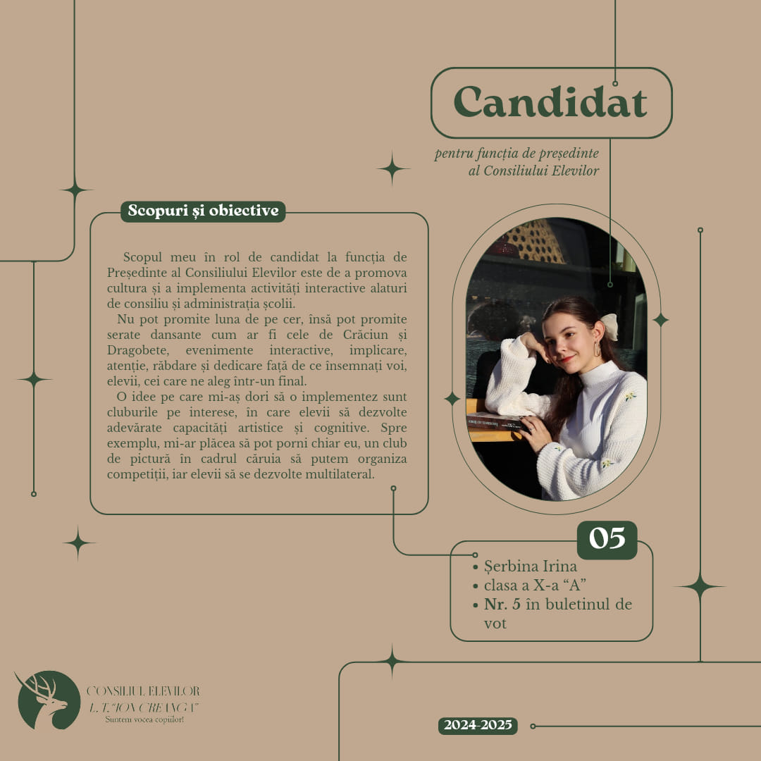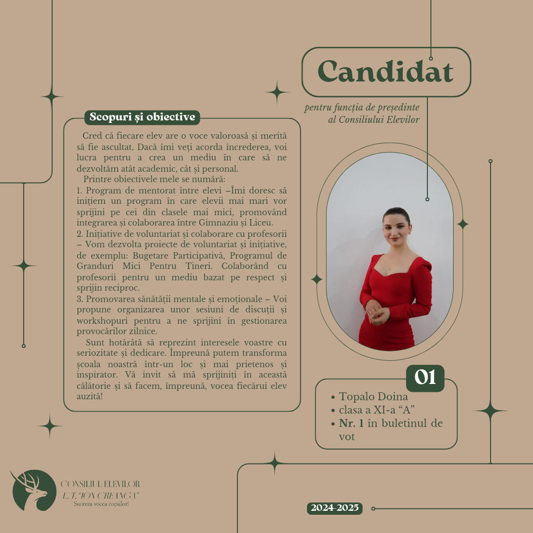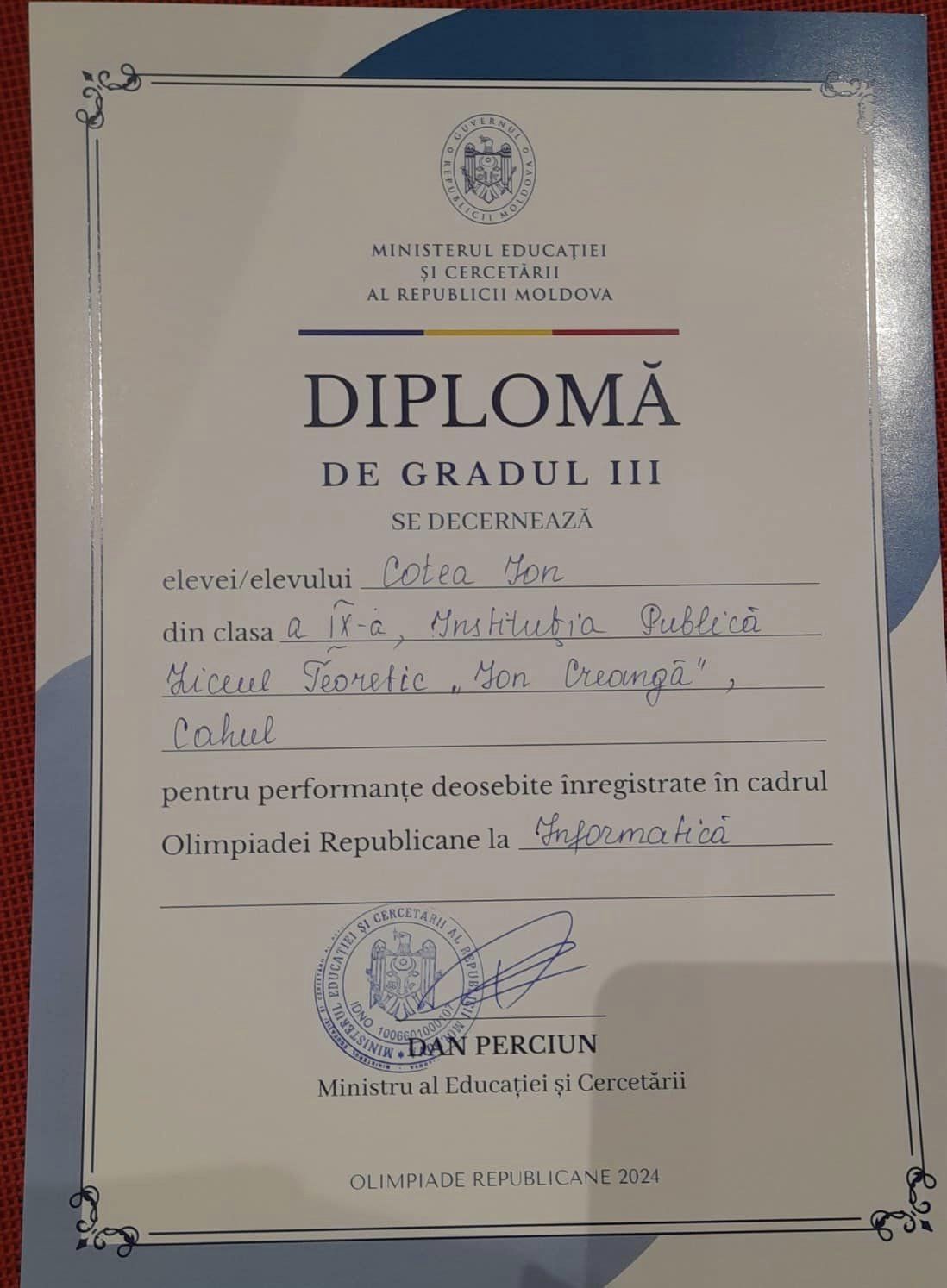 24.05.2025La 24 mai 2025, a avut loc etapa republicană a concursului național de lectură „La izvoarele înțelepciunii” organizat de către Ministerul Culturii al Republicii Moldova, Ministerul Educației și Cercetării, Biblioteca Națională pentru copii "Ion Creangă " Chișinău și Biblioteca "Grigore Vieru" din Cahul . Acest concurs, ajuns la cea de-a XXXV-a ediție, are ca scop promovarea lecturii și familiarizarea elevilor cu viața și activitatea personalităților din literatura, cultura, istoria națională și universală. Fiecare ediție are ca temă viața și activitatea unei personalități, iar anul acesta a fost consacrată scriitorului Aureliu Busuioc. Eleva noastră din clasa a X-a „A”profil umanist, Anastasiu Dorina, a reușit să se claseze pe locul III. Suntem extrem de mândri de rezultatul obținut și îi transmitem felicitări din suflet și încurajări pentru această realizare deosebită! Aducem sincere mulțumiri doamnei profesoare de limba și literatura română Marcu Alexandra și doamnei bibliotecare Matcaș Oxana pentru îndrumarea valoroasă și sprijinul oferit. Felicitări, Dorina! Suntem convinși că acest succes este doar începutul unui drum plin de realizări frumoase! Prin pasiunea ta pentru lectură, ai demonstrat nu doar o profundă înțelegere a textelor, ci și o sensibilitate aparte și o maturitate în gândire. Rezultatul obținut la concurs reflectă efortul, curiozitatea intelectuală și dragostea autentică pentru cărți. Ești un adevărat exemplu pentru colegii tăi și o sursă de mândrie pentru noi toți. Continuă să citești, să visezi și să inspiri!