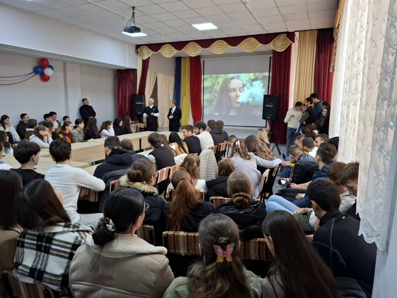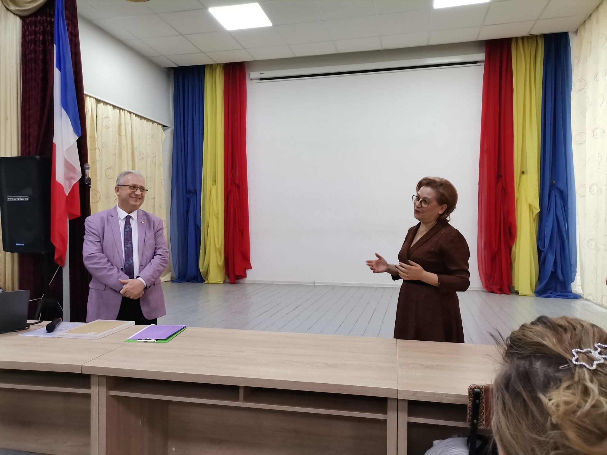 19.05.2025În baza unui acord de colaborare cu AO "Junact" Cahul și cu susținerea Alianței Franceze din Moldova, la inițiativa domnului Ghenadie Râbacov, liceul nostru a avut astăzi onoarea de a-i găzdui pe Jacqueline și Thierry, cetățeni belgieni și vorbitori nativi de limba franceză,care au fost însoțiți de Valeriu Baban, metodist limba franceză Direcția Generală Învățământ Cahul. Aceștia au desfășurat o activitate interactivă cu elevii liceeni, încurajați de profesoara Talchiu Rodica, abordând teme fundamentale precum democrația, libertatea, pacea și securitatea socială – valori care stau la baza bunei funcționări a Uniunii Europene. Scopul întâlnirii a fost de a încuraja comunicarea spontană și exprimarea liberă a elevilor în limba franceză, prin implicarea acestora într-un dialog autentic cu vorbitori nativi. Activitatea a oferit un context real de învățare și un schimb valoros de idei și perspective culturale. Mulțumim Alianța Franceză din Moldova! Mulțumim AO "Junact" Cahul și oaspeților noștri pentru această oportunitate deosebită! Mulțumim Direcției Generale de Învățământ Cahul.