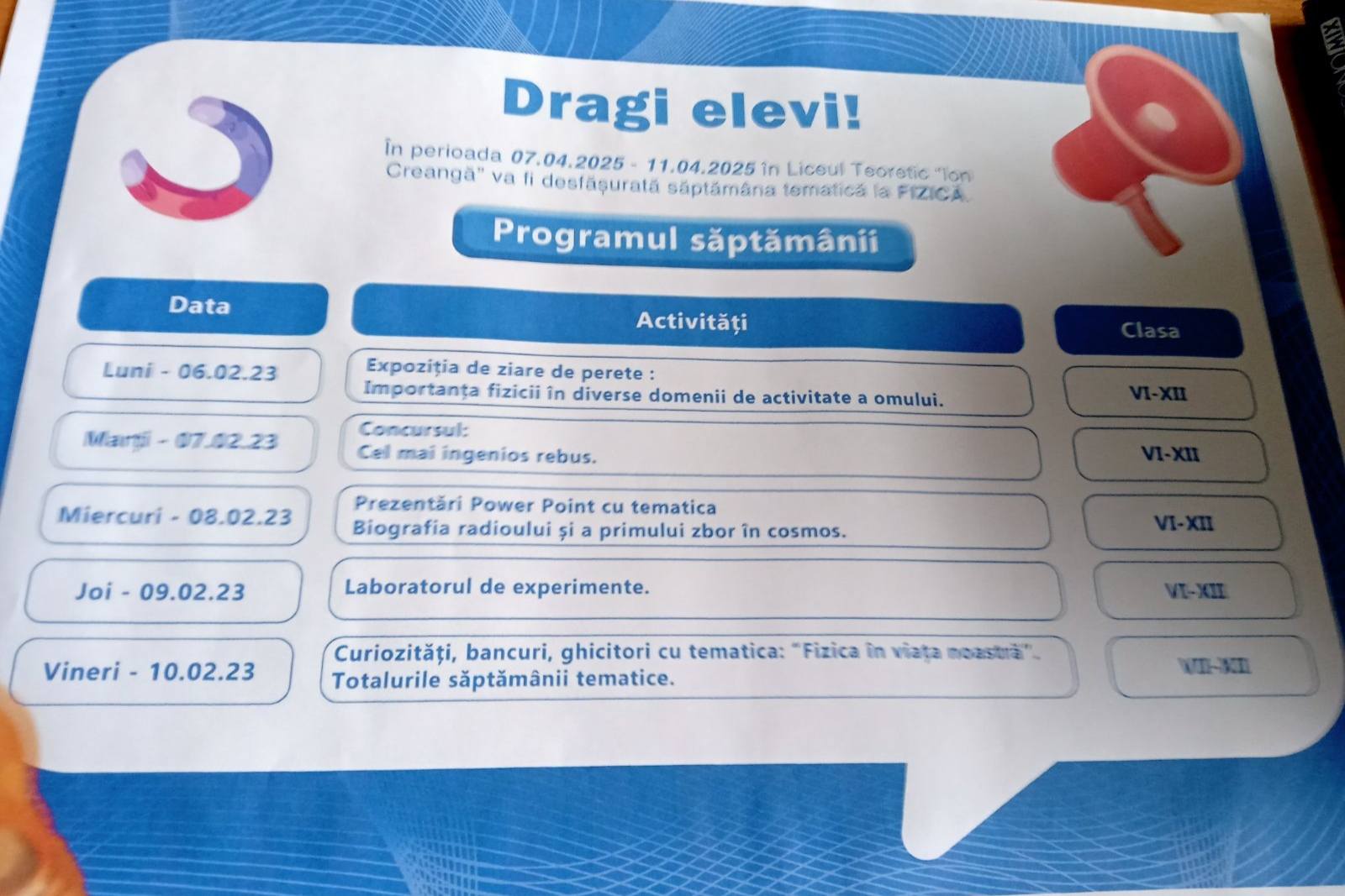 07.04–11.04.2025În perioada 07.04–11.04.2025, în cadrul Liceului Teoretic „Ion Creangă”, Comisia Metodică Științe a desfășurat conform Planului de activitate Săptămâna Fizicii, un eveniment dedicat descoperirii științei prin creativitate și implicare activă.