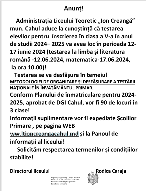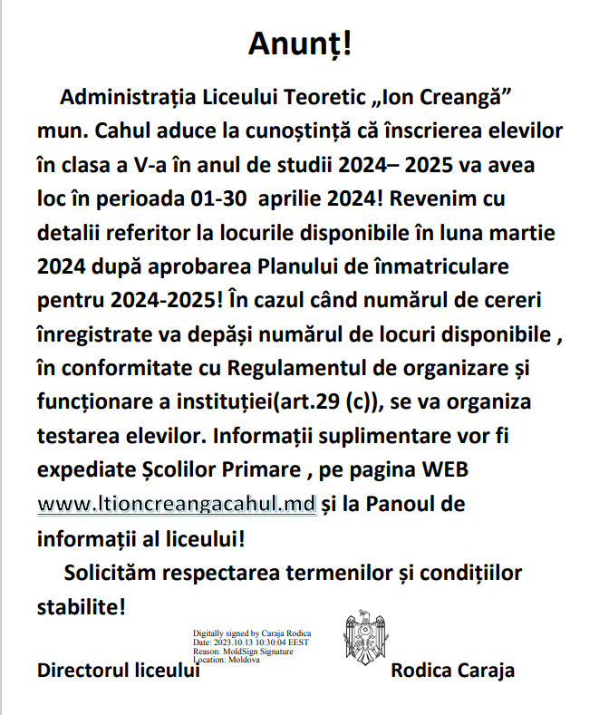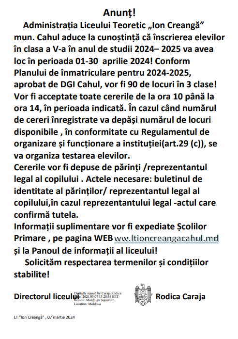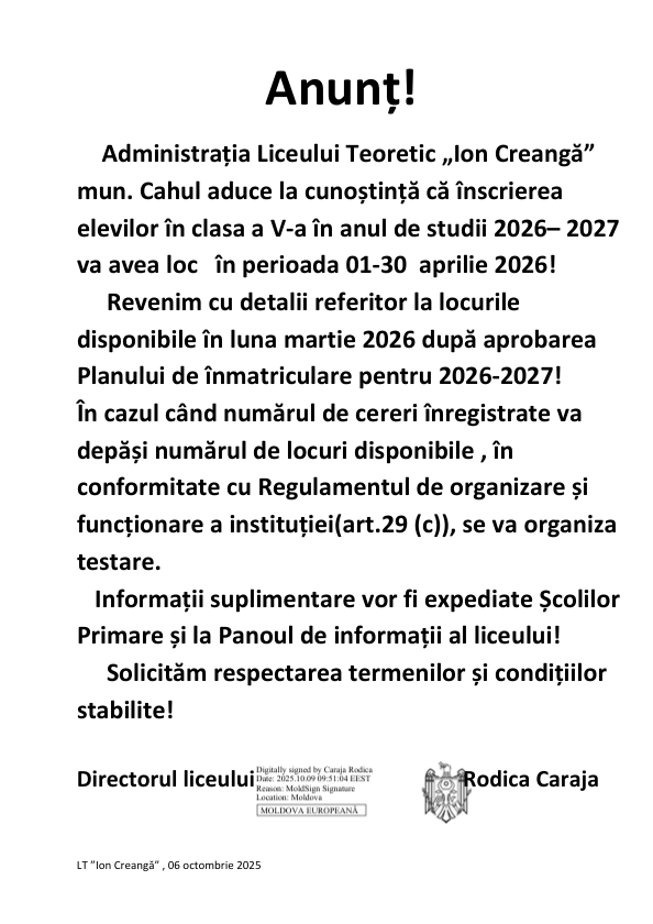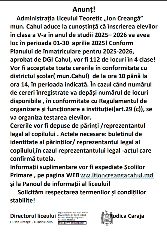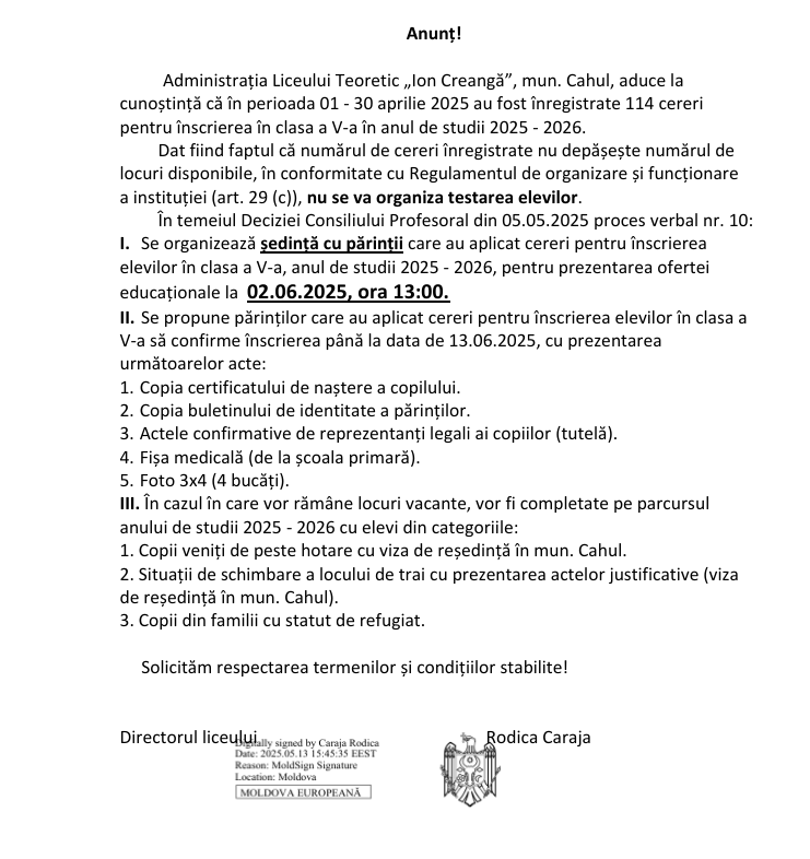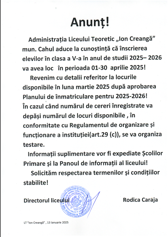 Informații privind înscrierea elevilor în clasa a V-a în anul de studii 2025-2026!