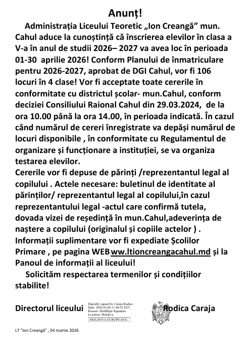 Înscrierea elevilor în clasa a V-a în anul de studii 2026-2027!