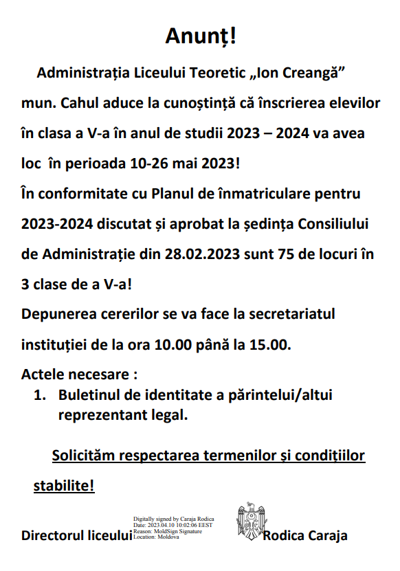 Depunerea cererilor se va face la secretariatul instituției de la ora 10:00 până la 14:00.